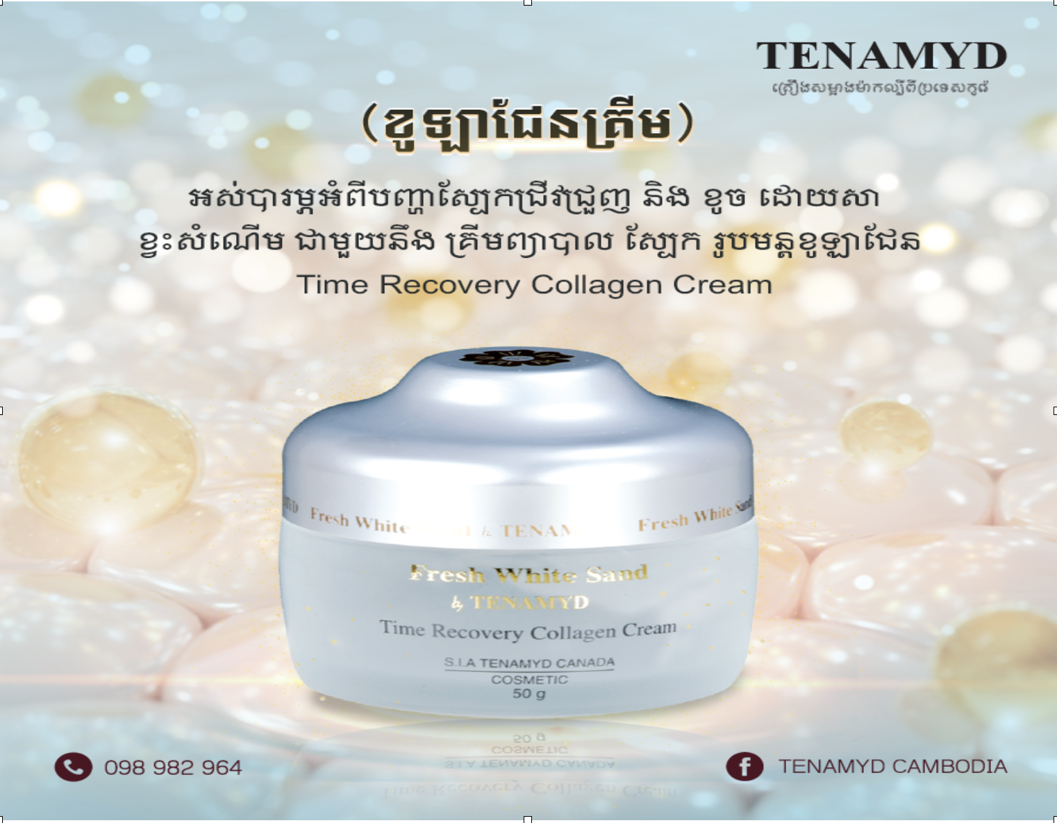 អំពីផលិតផល ៖ គ្រីមខូឡាជែន នឹងដោះស្រាយបញ្ហាស្បែកដែលខូច កាត់បន្ថយរាល់ស្នាមជ្រីវជ្រួញ និងការវិវត្តិនៃភាពចាស់យារនៃស្បែក។ ជួយថែរក្សាតុល្យភាពសំណើម និងជួយផ្សើមស្បែកដែលស្ងួត។ រូបមន្តចម្រាញ់ចេញពីគ្រាប់ធុញជាតិ Pantenol & PrimeRose នឹងជួយអោយស្បែកដែលងាយប្រតិកម្មទន់រលោង។ រូបមន្តចម្រាញ់ចេញពីតែបៃតង ខូឡាជែន និងស្លឹកប្រទាលកន្ទុយក្រពើ នឹងជួយបំពេញជាតិទឹកនៅក្នុងស្រទាប់ស្បែក ធ្វើអោយស្បែកមានសណ្ឋានតឹងណែនល្អ។ ហើយរូបមន្តកម្ទេចមាសរំលាយបញ្ចូល នឹងជួយលើកសម្បុរលោមពណ៌របស់ស្បែកអោយកាន់តែភ្លឺរលោងស្រស់ស្អាតចែងចាំង។ របៀបប្រើប្រាស់ ៖ ប្រើវាជាប្រចាំរៀងរាល់ព្រឹក និងពេលល្ងាចបន្ទាប់ពីការប្រើប្រាស់ Cleanser និង Toner ។ ក្នុងបរិមាណគ្រីមសមល្មមផ្ដិតនៅលើចុងម្រាមដៃ ម៉ាស្សាថ្មមនៅលើផ្ទៃមុខនិងស្បែកករហូតដល់ជ្រាបចូលអស់។